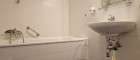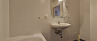 Das Badezimmerentzückt durch ein Waschbecken und eine Badewanne. Platz für eine Waschmaschine und einen Trockner ist gegeben.