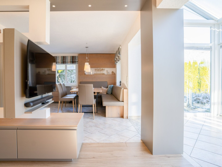 Der offenen Wohn- und Essbereich bildet das Herzstück des Hauses. Die bodentiefen Fenster des Wintergartens bringen Licht und Natur ins Innere - eine Atmosphäre, die man nur schwer beschreiben, aber sofort spüren kann. An kalten Tagen wärmt zusätzlich ein traditioneller Kachelofen. Die Küche ist modern und hochwertig ausgestattet. Das Obergeschoss bietet mit zwei Schlafzimmern einen herrlichen Rückzugsort. Neben dem Master-Schlafzimmer samt begehbarem Kleiderschrank gibt es ein weiteres Zimmer mit Ausgang auf den Südbalkon. Ein großes Badezimmer mit Doppelwaschbecken, Dusche, Badewanne und Fenster und ein extra WC mit Fenster ergänzen diese Ebene.