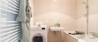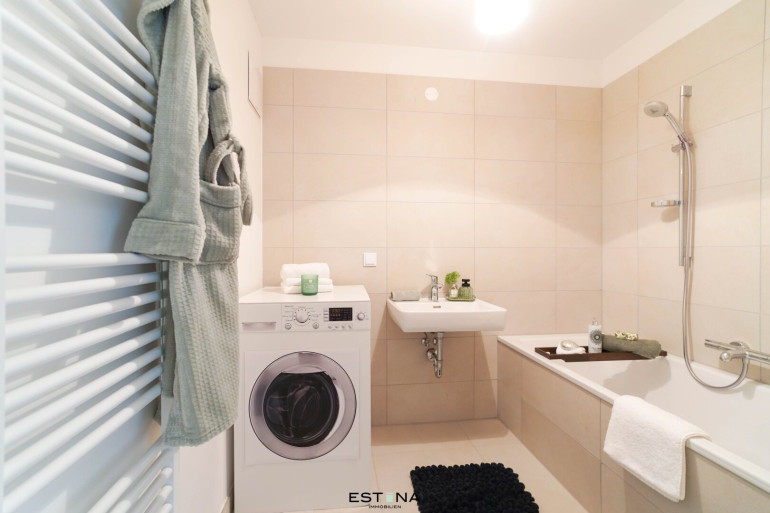 - Badezimmer mit Badewanne, Waschbecken und Waschmaschinenanschluss