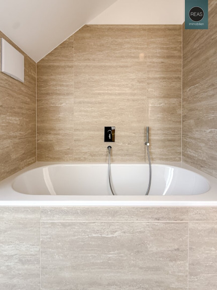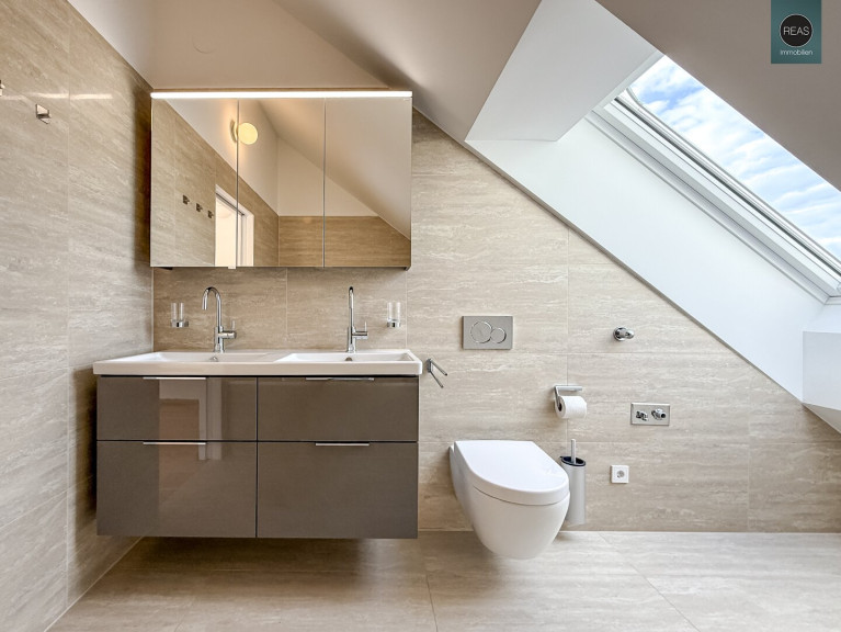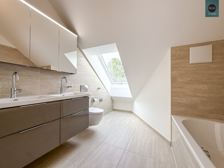 - 1 Badezimmer mit WC, Badewanne, Doppelwaschbecken samt Unterschrank, Spiegelschrank, Handtuchheizkörper, Waschmaschinenanschluss sowie einem Dachflächenfenster mit Blick in die Weinberge