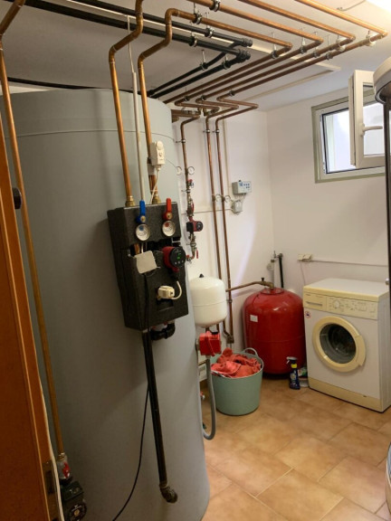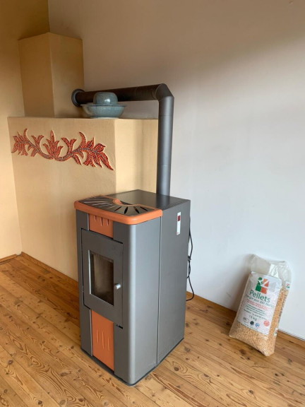 mit Niedrigsten Betriebskosten durch Boden und Wandheizung erzeugt durch die Solarenergie mit Pufferspeicher + Wand- und Fußbodenheizung + Kombiofen mit Automatik für feste Brennstoffe + Pellets-Ofen im Wohnzimmer.