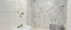 - Badezimmer mit Badewanne, Handwaschbecken und Platz für eine Waschmaschine sowie separates WC