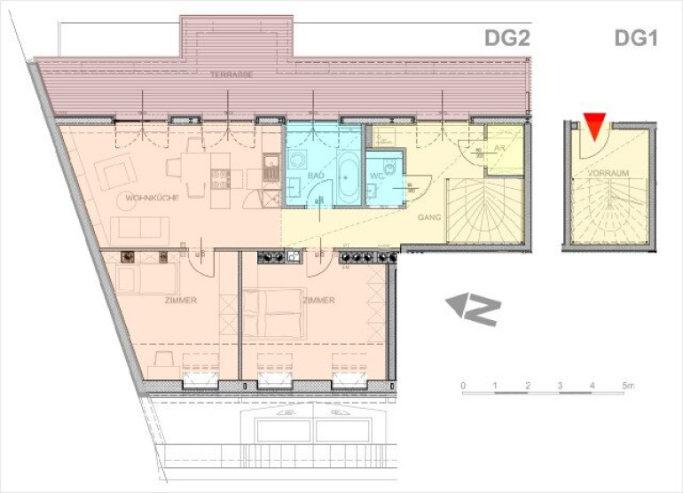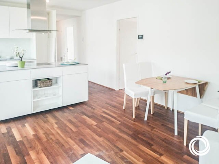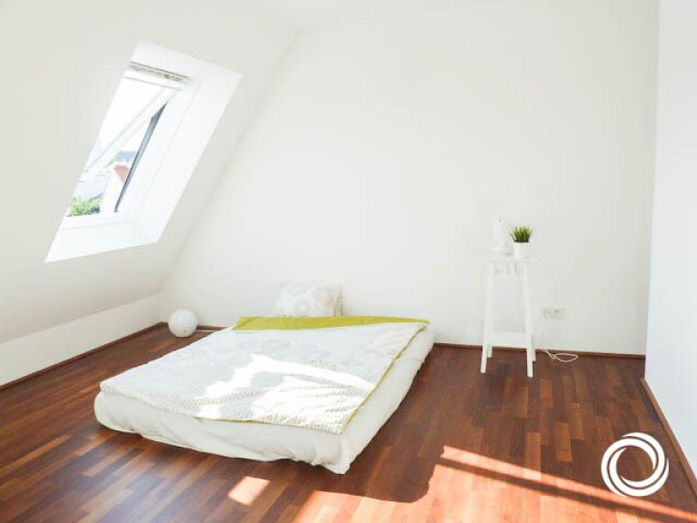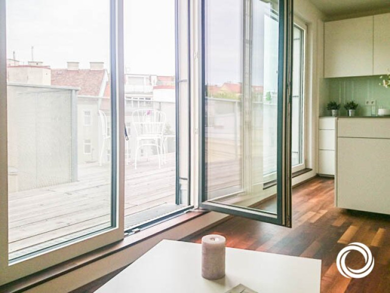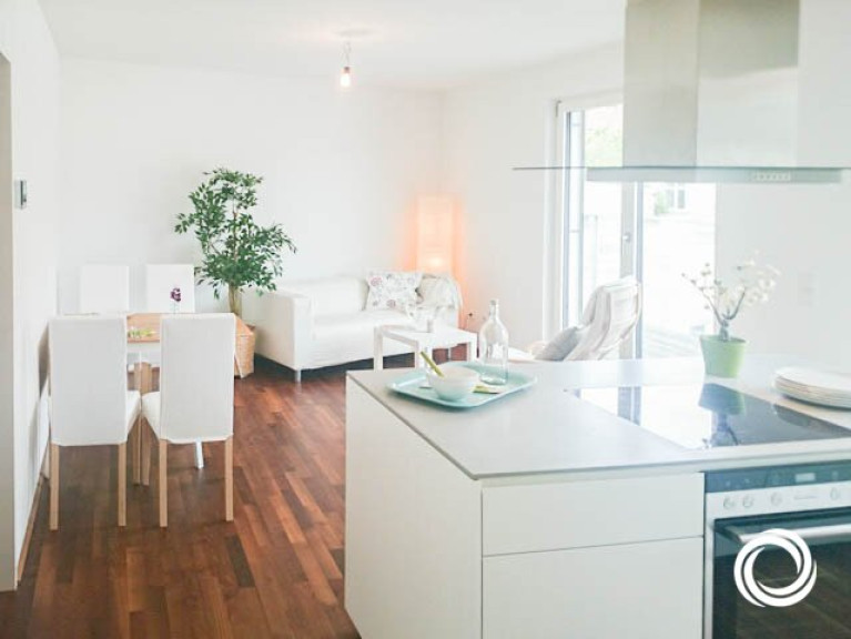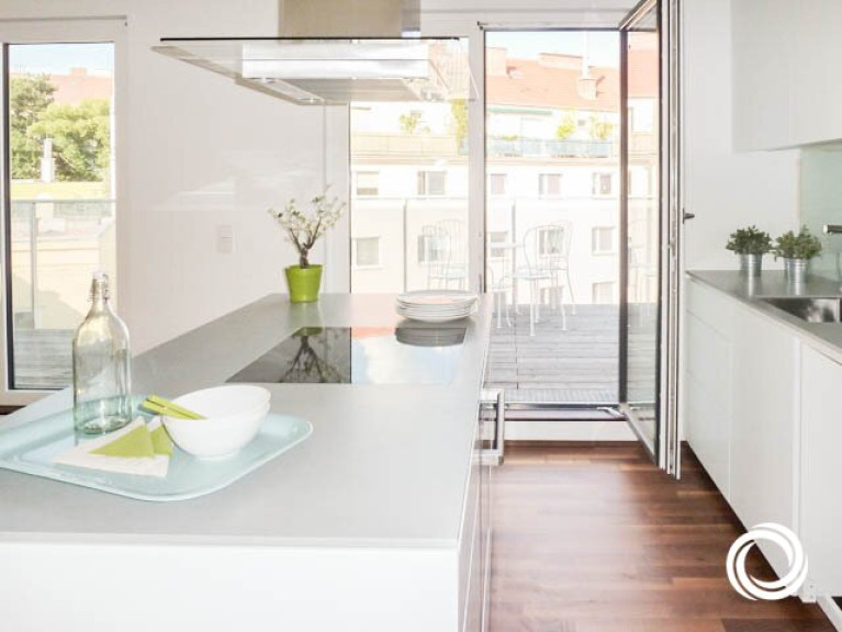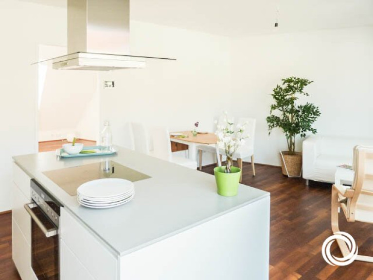 Die schicke Wohnung ist in zwei Ebenen aufgeteilt (DG1 + DG2). In der unteren Ebene befindet sich der Vorraum, der als Stauraum genutzt werden kann und die Treppe zur oberen Ebene. Hier erwarten Sie drei Zimmer, von denen eines als große Wohnküche mit Zugang zur Terrasse gestaltet ist. Mit Sträuchern und Blumen dekoriert, schaffen Sie sich Ihre persönliche Grünoase! Die moderne Kochinsel lädt zum gemeinsamen Kochen ein. Die zwei weiteren Zimmer können als Kinder-, Gäste- oder Arbeitszimmer genutzt werden. Praktisch ist der kleine Abstellraum. Die geölten Akazien-Fertigparkettböden verleihen ein edles Ambiente und viel feines Wohlgefühl.