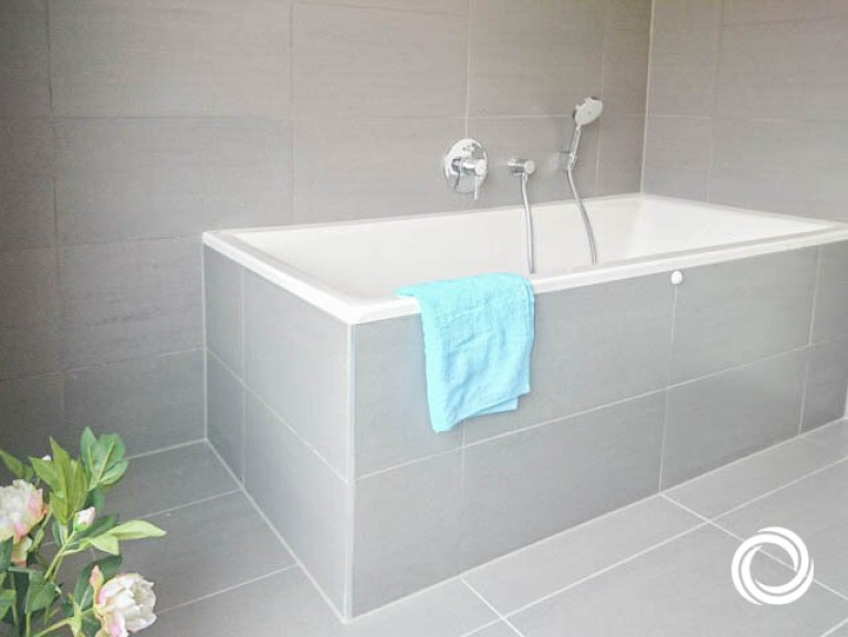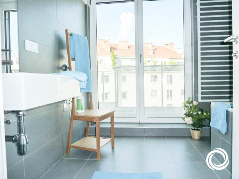 +) Badezimmer mit Badewanne, Waschbecken, Handtuchtrockner, Waschmaschinenanschluss