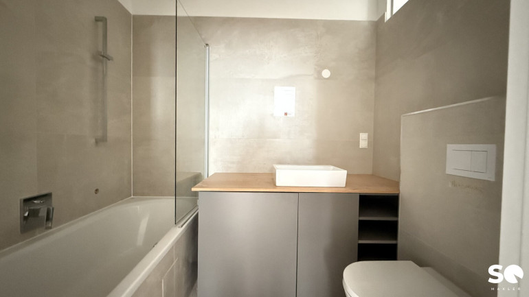Das Badezimmer ist mit einer modernen Badewannne, Waschmaschinenanschluss als auch Waschbecken und WC ausgestattet. Dank neuer Fenster genießen Sie angenehme Lichtverhältnisse und ausgezeichnete Wärmedämmung, während Sie den Altbaucharakter in vollen Zügen erleben können.