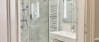 + Bad mit bodengleicher Dusche, Waschbecken und Handtuchwärmer