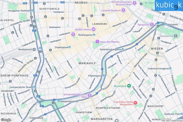 Die Wohnung genießt eine erstklassige Lage, lediglich wenige Gehminuten von der belebten Einkaufsmeile Mariahilfer Straße und er U3-Station Zieglergasse entfernt. Die U4-Station Pilgramgasse ist ebenfalls bequem in nur etwa 500 Metern erreichbar. Hervorragende Anbindung an den öffentlichen Nahverkehr wird durch die unmittelbare Nähe zu den Buslinien 57A, 13A und 14A gewährleistet. Ein zusätzlicher Komfort bietet sich direkt im Wohnhaus mit einem integrierten BILLA-Supermarkt. Des Weiteren stehen zahlreiche weitere Einkaufsmöglichkeiten sowie Schulen, Kindergärten und das Krankenhaus Barmherzige Schwestern mit exzellenter medizinischer Versorgung in der näheren Umgebung zur Verfügung. Die Mariahilfer Straße ist einer längsten Straßen Wiens und ein Muss für shoppinglustige Touristen, sowie für Wiener zugleich. Hier finden Sie Shops, ausgewählte Lokale und Restaurants, Anfahrt und Parkmöglichkeiten sowie Tipps für Ihr kulturelles Entertainment rund um die beliebteste Einkaufsstraße Wiens.
