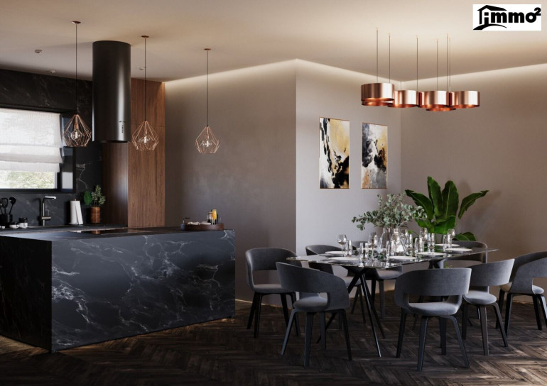 Drei Meter Raumhöhe verleihen jedem Bereich eine spürbare Großzügigkeit. Licht durchflutet die Räume, trifft auf tiefdunkles Fischgrätparkett und fein abgestimmte Naturmaterialien wie Marmor und Granit.