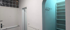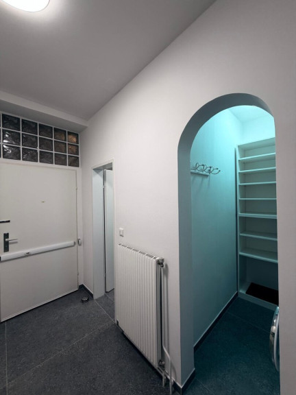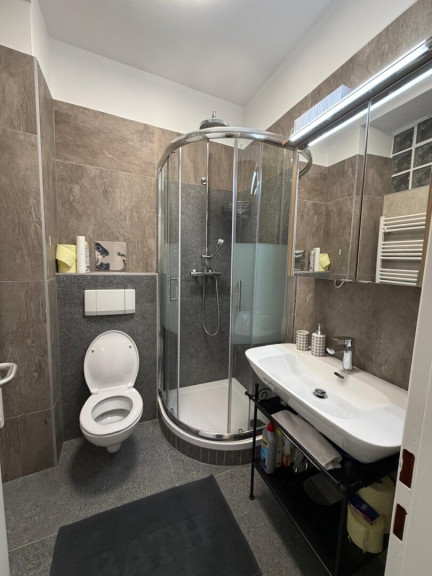 Der Eingangsbereich mit seiner funktionalen Gestaltung bietet eine integrierte Garderobenlösung mit viel Platz für Kleidung und Stauraum und geht fließend in die moderne, kompakte Küchenzeile über. Diese bietet ausreichend Stauraum in Ober- und Unterschränken sowie alle notwendigen Küchengeräte für den täglichen Bedarf. Ein Glasbaustein-Fenster sorgt für Tageslicht bei gleichzeitiger Privatsphäre. Der Boden ist mit pflegeleichten Marmorfliesen ausgestattet – praktisch und elegant zugleich. Das Badezimmer präsentiert sich zeitlos modern und funktional und ist mit einer Dusche und Waschmaschine ausgestattet.