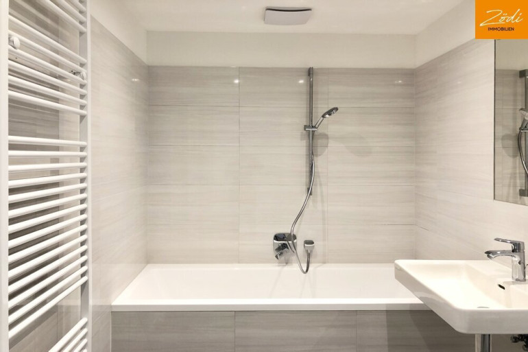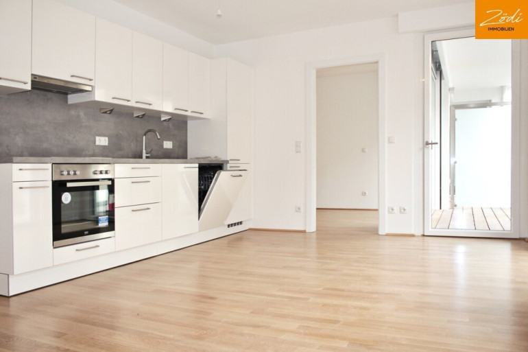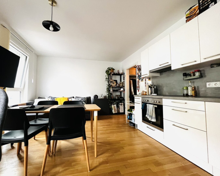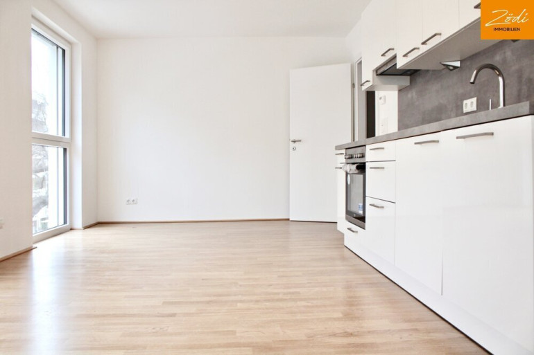 Diese attraktive Wohnung verfügt über einen geräumigen Vorraum, eine Wohnküche mit hochwertiger Einbauküche, ein Schlafzimmer mit Zugang zur ruhigen Loggia, ein edles Badezimmer und separates WC mit Waschbecken.