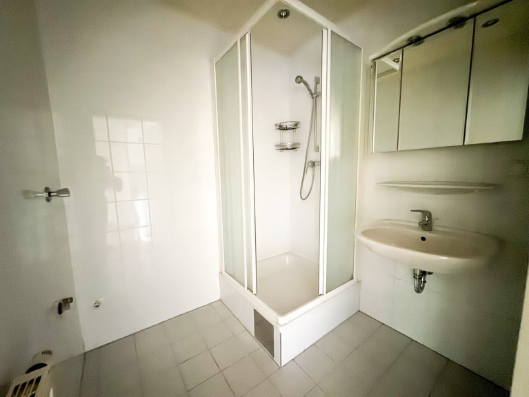 Die helle Wohnung liegt in einem sehr gepflegten Gebäude im 2. Liftstock. Sie verfügt über ein großes Wohn-/Schlafzimmer mit Küchennische, ein modernes Badezimmer mit Dusche und WM-Anschluss, ein separates WC, einen Abstellraum und einen Vorraum.