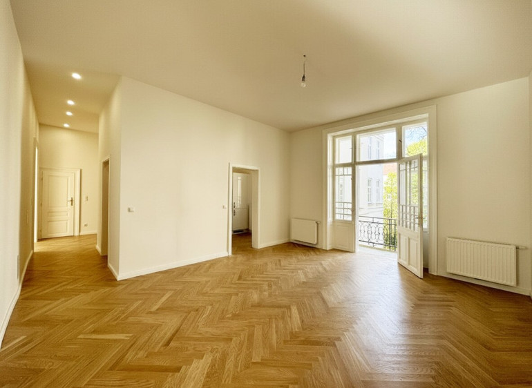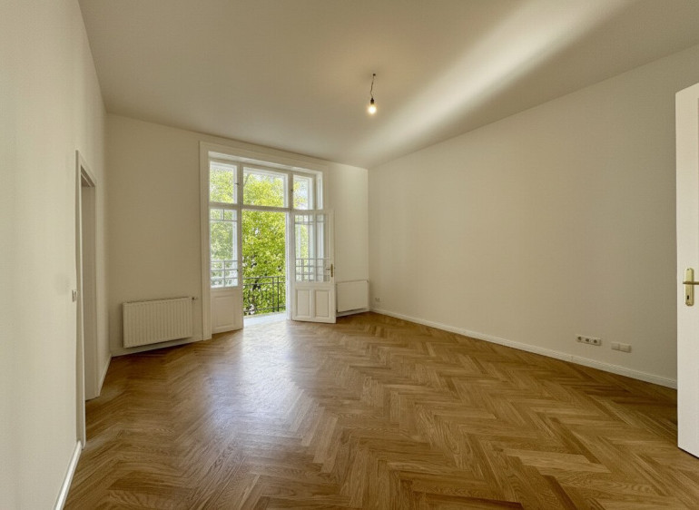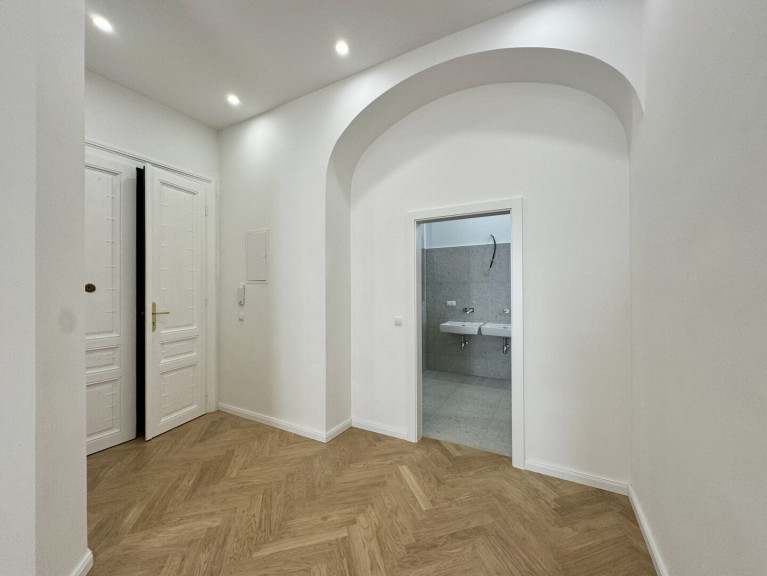 Ein hochwertiger Fischgrätparkett aus Eiche wurde neu verlegt. Im Vorraum sowie in den Sanitärräumen wurden moderne Deckenspots integriert. Die beeindruckende Raumhöhe von ca. 3,20 m verleiht der Wohnung ein besonders großzügiges und elegantes Wohngefühl und unterstreicht den klassischen Altbaucharakter.