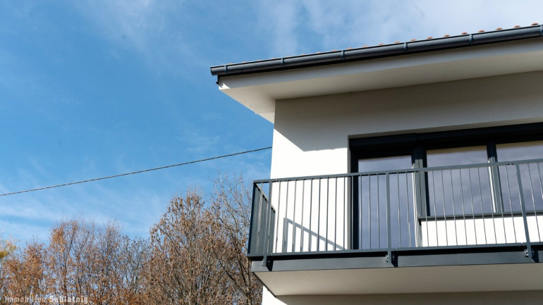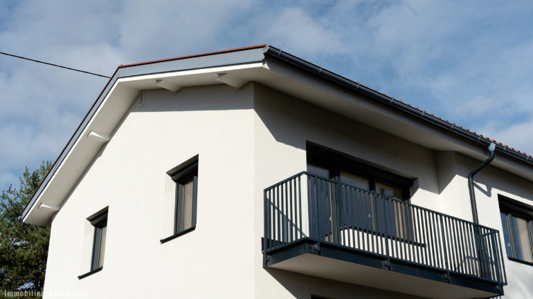 Über einen breiten, eleganten Treppenaufgang mit hochwertigen Dielenböden gelangen Sie ins Obergeschoss, das lichtdurchflutet, großzügig und einladend gestaltet ist. Hier erwarten Sie drei geräumige Schlafzimmer, eines mit direktem Zugang zum großzügigen Balkon, der viel Platz für gemütliche Sitzgelegenheiten, Pflanzen oder entspannte Sonnenstunden bietet. Ergänzt wird das Angebot durch ein weiteres helles Badezimmer mit Glasdusche und ein separates WC.