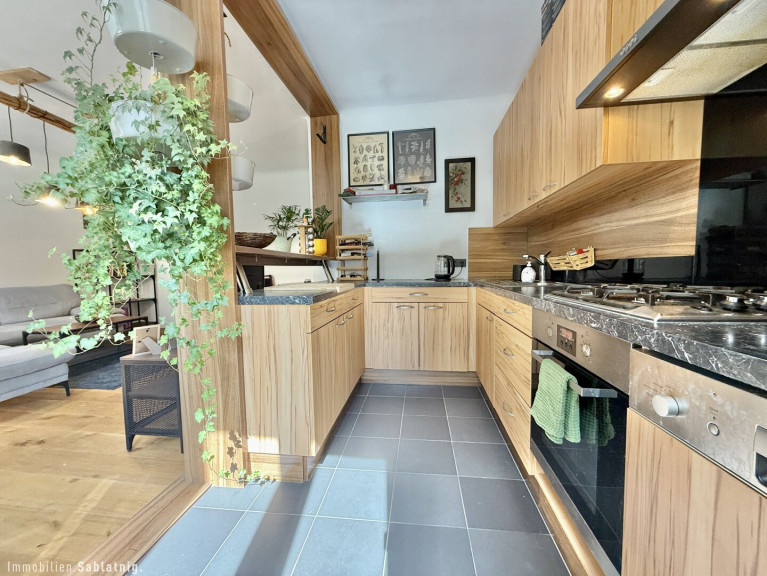 Die Wohnung ist mit hochwertigen Materialien ausgestattet. Fliesen und Parkett sorgen für eine warme, einladende Atmosphäre, während die moderne Etagenheizung auf Gasbasis für behagliche Wärme an kalten Tagen sorgt. Die Einbauküche ist nicht nur funktional, sondern auch stilvoll gestaltet – hier macht das Kochen gleich doppelt so viel Freude.