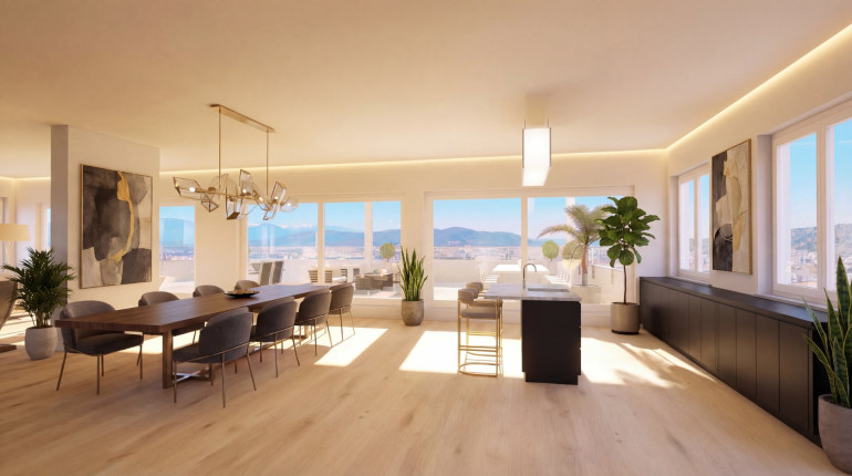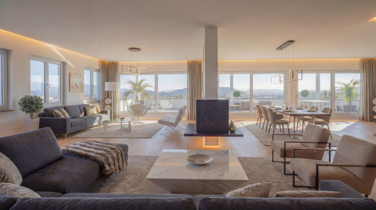 „Ein Teil der abgebildeten Darstellungen basiert auf hochwertigen Visualisierungen und dient dazu, die außergewöhnlichen Gestaltungsmöglichkeiten dieser einzigartigen Penthouse-Etage auf inspirierende Weise erlebbar zu machen.“