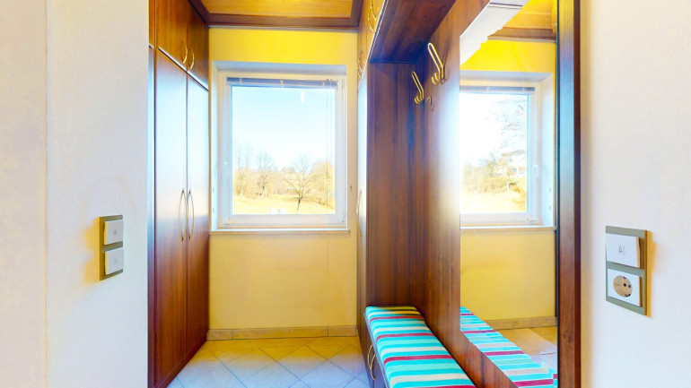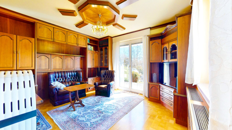 Das Obergeschoss erweitert das Raumangebot noch einmal deutlich und schafft ideale Voraussetzungen für eine große Familie oder für Wohnen mit mehreren Generationen. Laut Grundriss stehen hier ein Schlafzimmer, zwei weitere Familienzimmer, ein Esszimmer, eine Küche, ein Badezimmer, ein separates WC, ein großzügiger Flur sowie der Balkon zur Verfügung. Dadurch entsteht eine Struktur, die nicht nur viel Platz bietet, sondern auch unterschiedliche Nutzungsszenarien zulässt – etwa als Familienetage, Gästebereich, Rückzugszone für Kinder und Jugendliche oder als Kombination aus Wohnen und Arbeiten. Der im Exposé ausgewiesene Balkon ergänzt diese Ebene um einen attraktiven Außenbereich mit schönem Wohnwert. Zudem sind laut Ausstattung Bergblick, Fernblick und Grünblick vorhanden, was den qualitativen Gesamteindruck zusätzlich aufwertet.