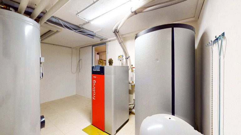 Ein wesentlicher Mehrwert liegt im Keller- bzw. Untergeschoss, das weit über klassische Nebenflächen hinausgeht. Dort zeigen die Pläne und Fotos mehrere Lagerräume, einen Heizungsraum, einen Pelletraum, einen Flur sowie einen zusätzlichen Büro- bzw. Nutzraum. Gerade für Käufer, die gezielt nach einem Haus mit viel Stauraum, Haus mit Lagerflächen, Haus mit Keller, Haus mit Werkstattpotenzial, Haus mit Hobbyräumen oder Haus mit separatem Arbeitsbereich suchen, ist das ein starkes Verkaufsargument. Die vorhandene Pellet-Zentralheizung ist in diesem Bereich untergebracht und unterstreicht gemeinsam mit dem separaten Pelletraum die funktionale und nachhaltige Ausrichtung der Haustechnik.