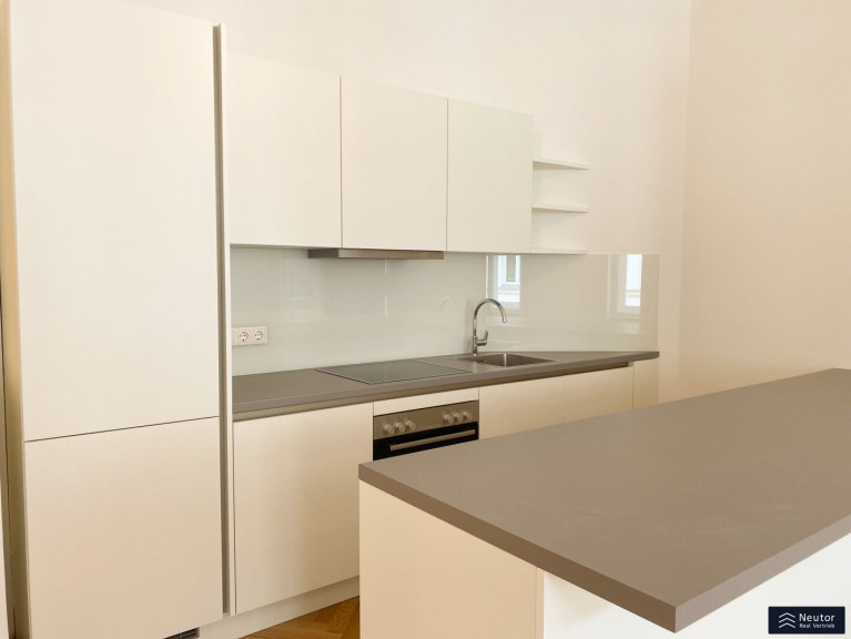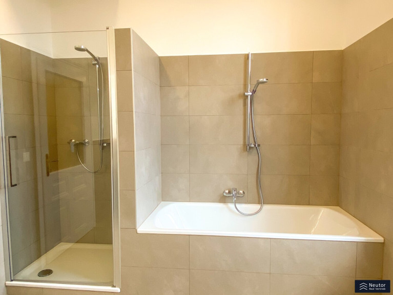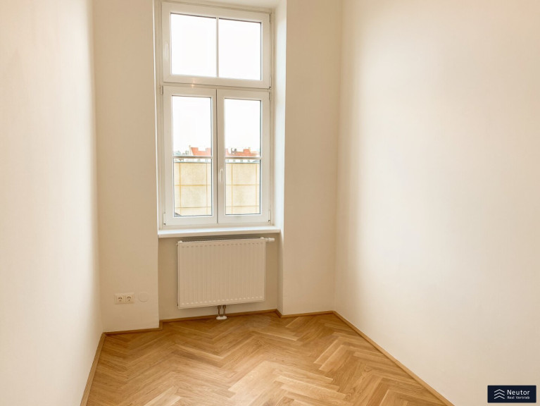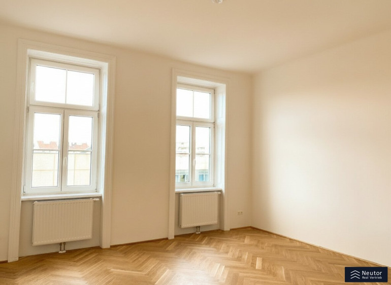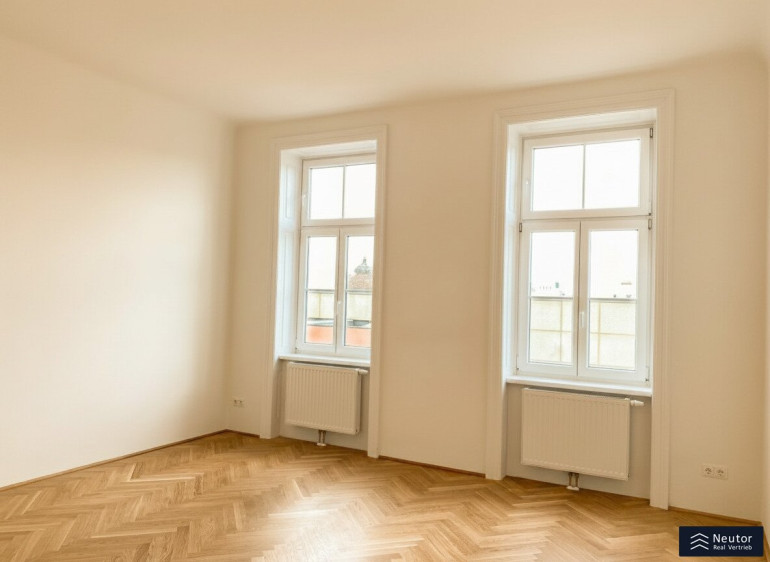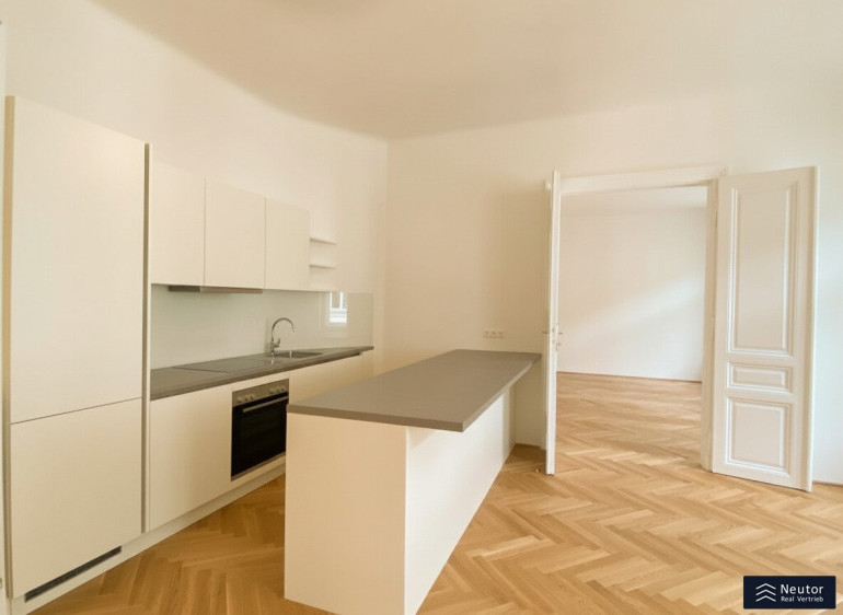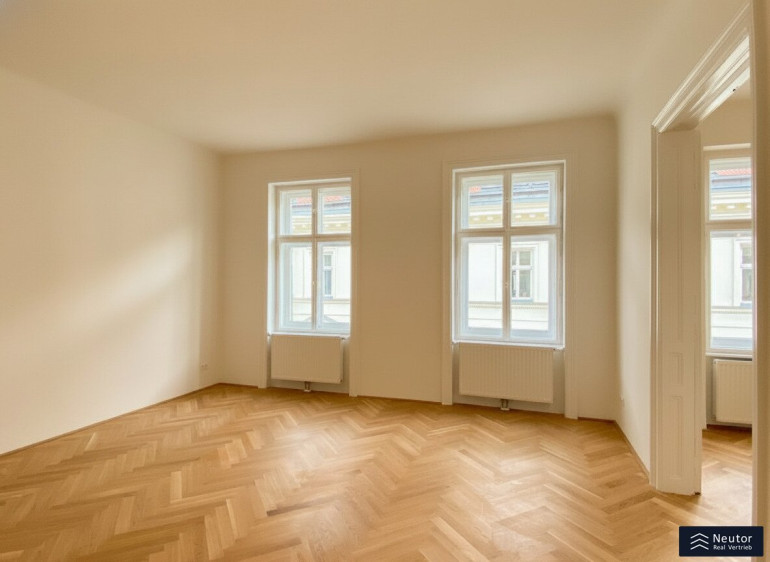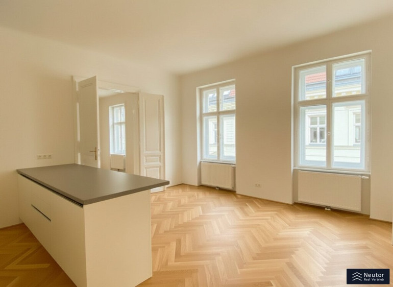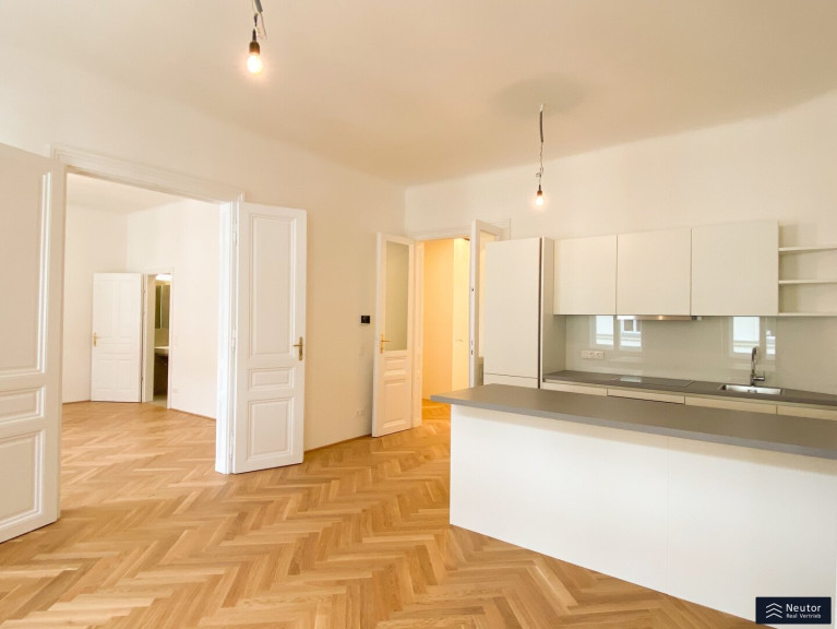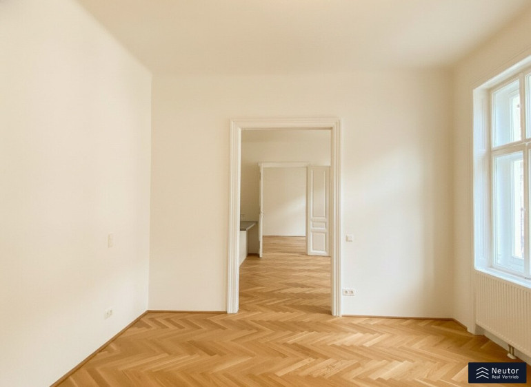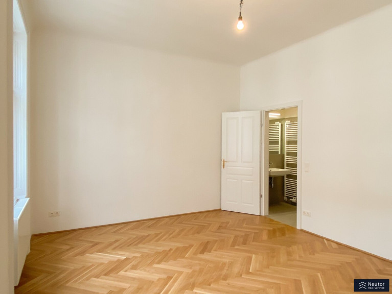 Das Herzstück der Wohnung bildet der großzügige Wohnbereich mit direktem Übergang zur voll ausgestatteten Wohnküche, die sich elegant in das Gesamtbild des Raumes einfügt. Großzügige Fenster durchfluten die Räume mit Tageslicht und schaffen eine helle, angenehme Atmosphäre. Ein weiteres Zimmer, von der Wohnküche aus zugänglich, verfügt über ein en-suite Badezimmer und eignet sich ideal als Master-Bedroom oder privaten Rückzugsraum. Typische Altbaudetails wie elegante Flügeltüren, ein hochwertiger Parkettboden und klassische Kastenstockfenster unterstreichen den besonderen Charakter dieser Wohnung. Die ruhige Ausrichtung in den Innenhof rundet das Gesamtbild ab und sorgt für ein entspanntes, harmonisches Wohngefühl.