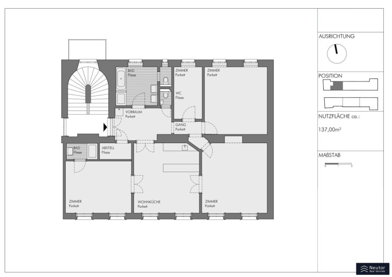 Fliesen, Parkett, Gas, Etagenheizung, Einbauküche, Wohnküche / offene Küche, Personenaufzug, Bad mit Fenster, Badewanne, Dusche