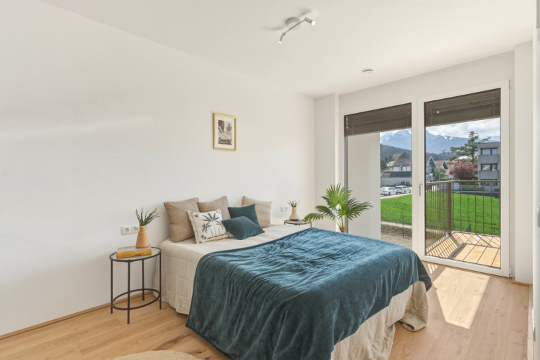 Auch das Schlafzimmer bietet einen Zugang ins Freie und unterstreicht den besonderen Wohnkomfort. Hochwertige Ausstattungsdetails wie Eichenparkett in den Wohnräumen, ein modernes Badezimmer mit Fenster sowie praktische Nebenflächen runden das Angebot ab.