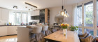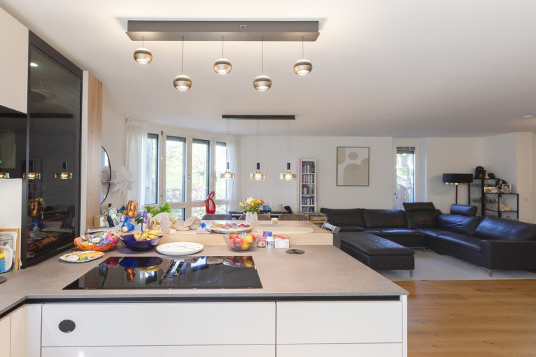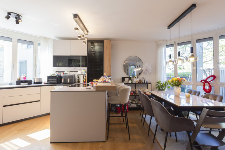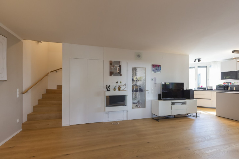 Wohnzimmer mit angrenzender Einbauküche und Zugang zur 1. Loggia und dem Garten, separates WC, Abstellraum Vorzimmer,