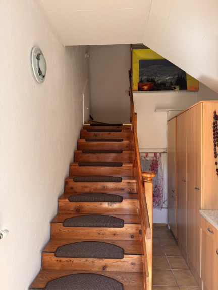 Die Wohnung im Obergeschoss verfügt über einen separaten Eingang, ca. 76 m² Wohnfläche und besteht aus einem Vorraum, einer Küche mit Essbereich, einem Wohnzimmer, zwei Schlafzimmern sowie einem Bad mit Waschgelegenheit, Dusche und WC.