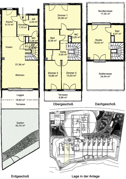 Das angebotene Reihenhaus liegt im Westtrakt der Wohnhausanlage und ist vom Gästeparkplatz aus durch den Gemeinschaftsgarten erreichbar. Dem Reihenhaus ist ein fixer Stellplatz in der Haustiefgarage zugeordnet, die unter dem Haupttrakt liegt, wo auch die Einlagerungsräume untergebracht sind.