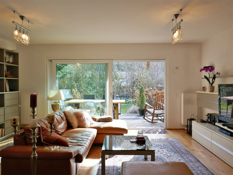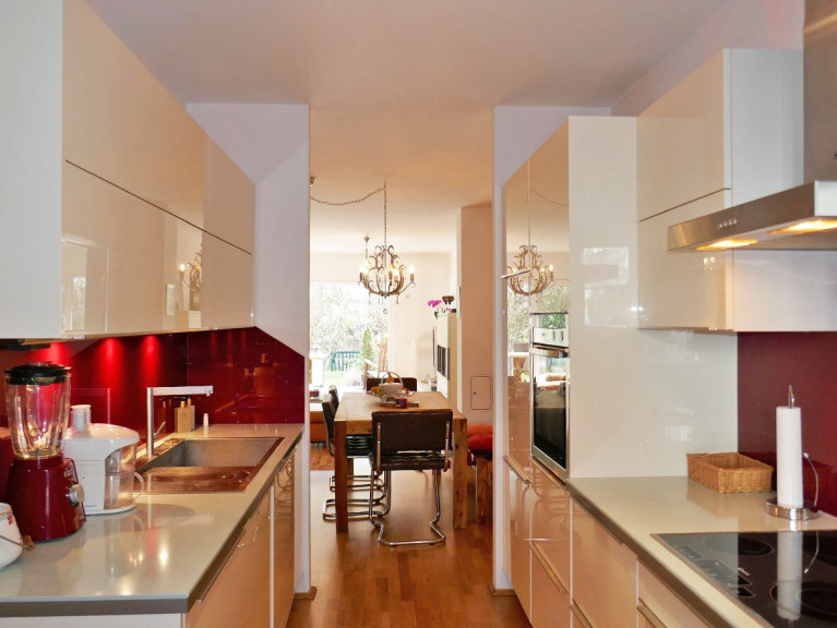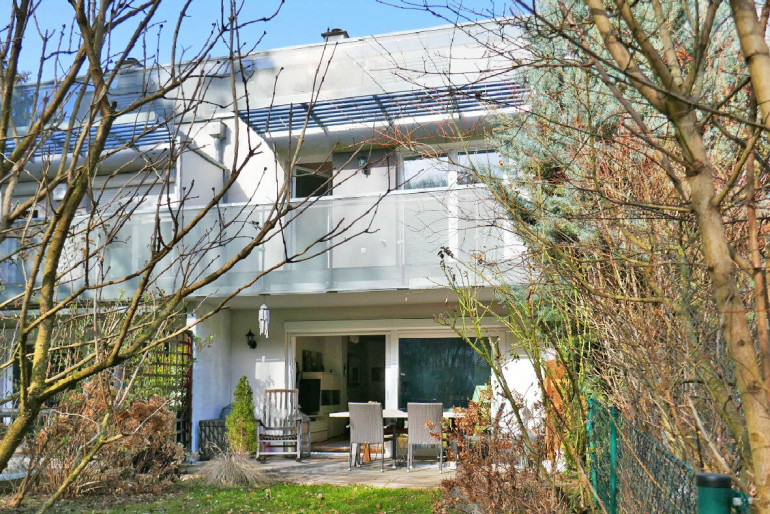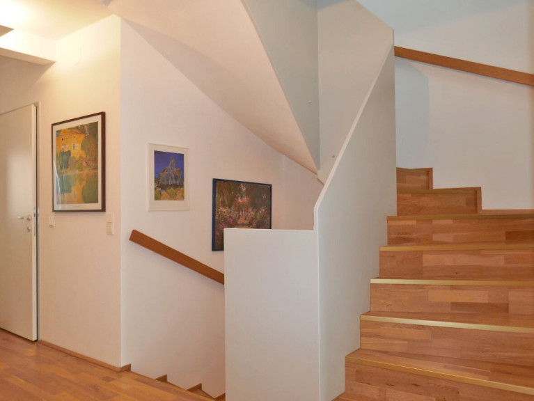 Das hochwertige Reihenhaus bietetca. 148 m² Wohnfläche verteilt auf drei Ebenen. In jedem Geschoß sind großzügige Terrassen, sowohl Richtung Süden als auch Richtung Norden zu finden. Das Erdgeschoß unterteilt sich in den Eingangsbereich mit Vorraum, zwei Abstellräume und WC, die Küche sowie in das über 37 m² große Wohn-Esszimmer mit Ausgang auf die Gartenterrasse. Die zum Wohnzimmer hin offene, cremefarbene Hochglanz-Küche ist von der Firma Ewe und mit Neff Einbaugeräten und einer Liebherr Kühl- und Gefrierkombination ausgestattet.
