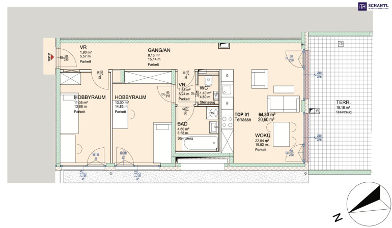 Wohnfläche: ca. 64,3 m² + Terrasse: ca. 19,18 m² + Kellerabteil