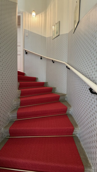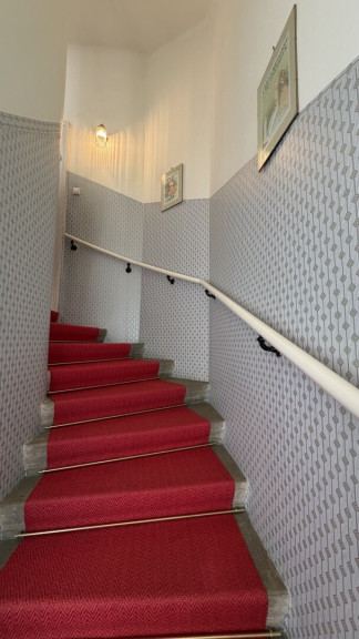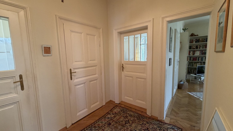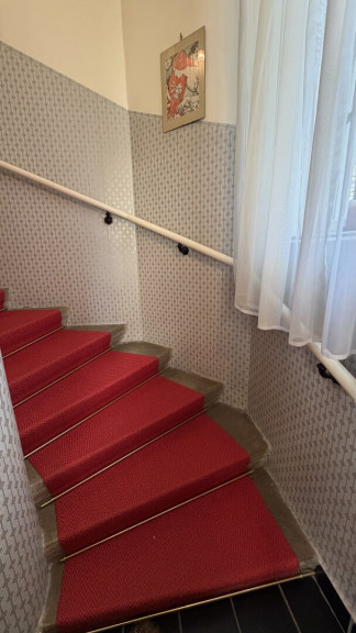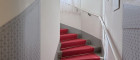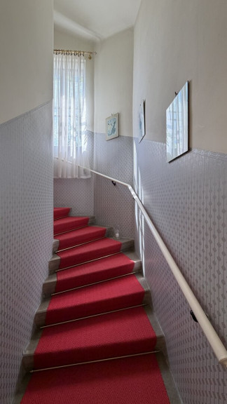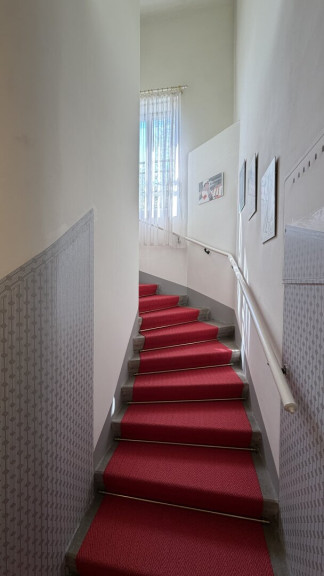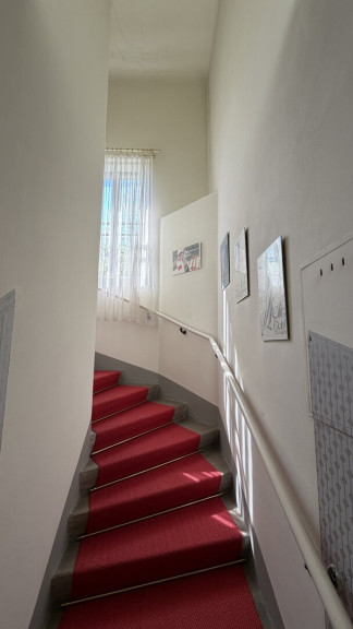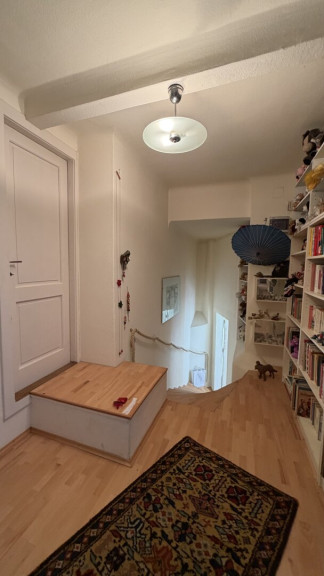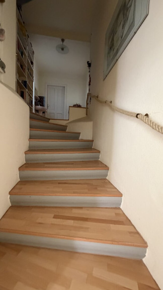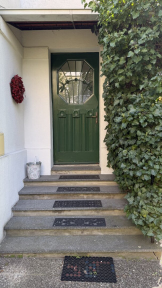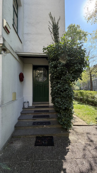 Der diskret auf der straßenabgewandten Seite gelegene Haupteingang ist über wenige Stufen erreichbar und führt in ein charmantes Stiegenhaus, das die einzelnen Wohnebenen miteinander verbindet.