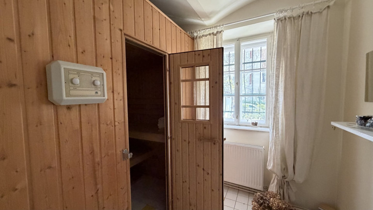 Das nahezu ebenerdige Souterrain präsentiert sich wohnlich ausgebaut und überzeugt mit besonderen Highlights wie Sauna, großzügigem Sanitärbereich mit Ausgang ins Freie sowie sichtbaren Gewölbestrukturen. Die Haustechnik ist ebenfalls hier untergebracht.