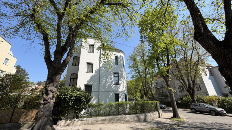 Äußerlich besticht die weiß verputzte Jugendstilvilla durch ihre klare Eleganz: Dezente Fensterrahmungen, gesimsartige Überdachungen und original erhaltene, grün gefasste Kastenfenster prägen ihr Erscheinungsbild. Ein Erker mit darüberliegendem Balkon sowie eine geschwungene Dachgaube setzen architektonische Akzente.
