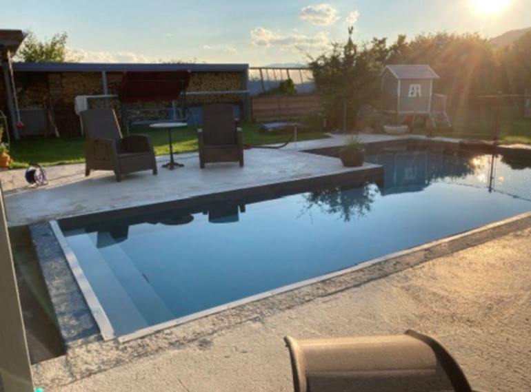 Im Erdgeschoss befindet sich ein Büro - auch ideal als Praxis oder Werkstatt nutzbar. Der exklusive Wohnbereich im Obergeschoss liegt auf einer Ebene mit Garten und Pool und schafft ein einzigartiges Wohngefühl.