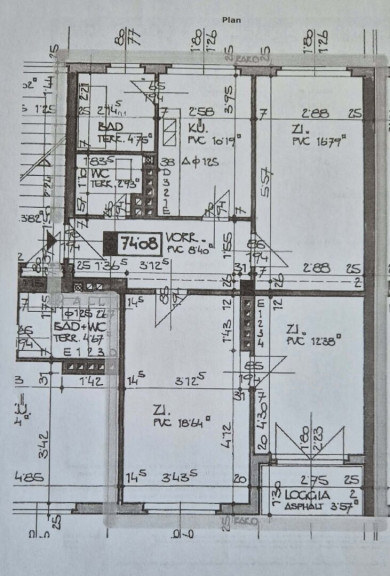Raumaufteilung: Vorraum, 3 Zimmer, Küche, Loggia, Tageslichtbadezimmer, WC