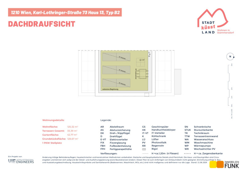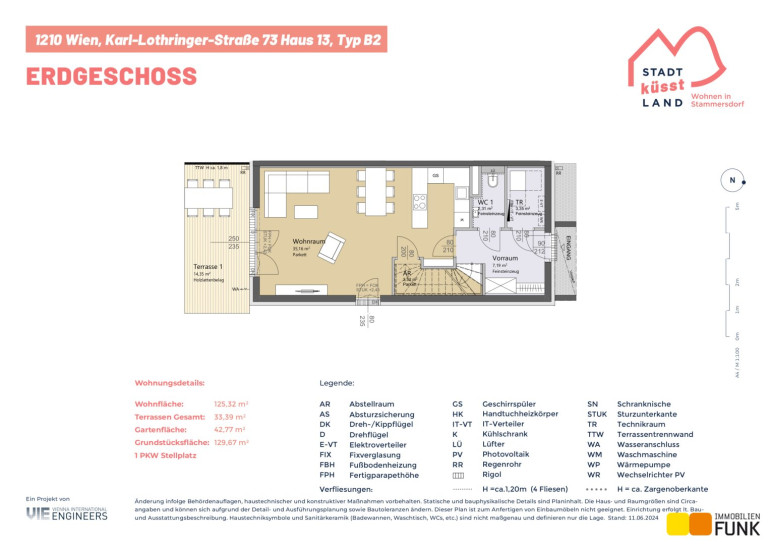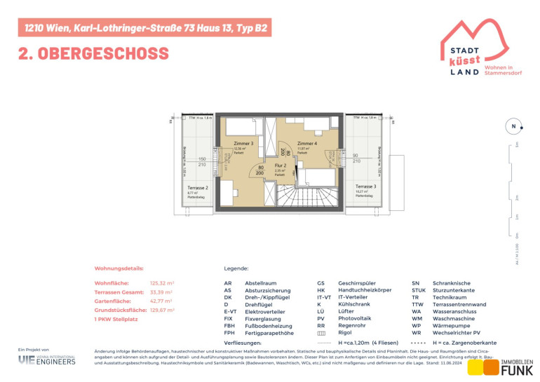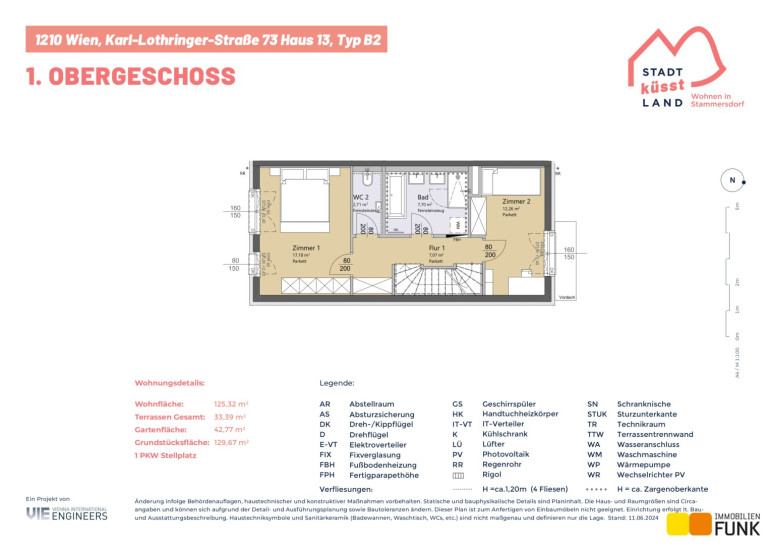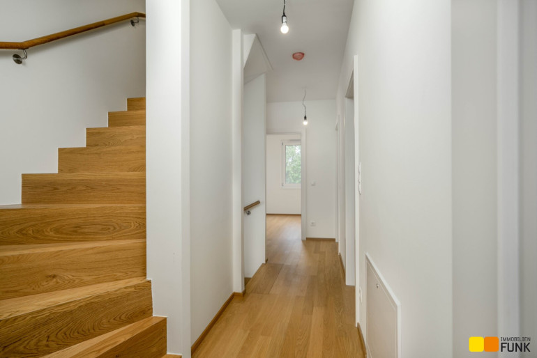Wohnfläche insgesamt ca. 125 m², angeordnet auf drei Geschoßen mit 5 Zimmern, 2 Toiletten, einem großen Badezimmer, dem Technikraum und einem Abstellraum, sowie einer südseitig ausgerichteten Terrasse mit ca. 14 m², die sich zu einem gemütlichen Gartenbereich mit ca. 42 m² öffnet. Im Dachgeschoß befinden sich zudem zwei Dachterrassen mit ca. 10 m² und 8 m². Die monatliche Miete für den KFZ-Stellplatz direkt vor der Haustür beträgt € 109 inkl. Betriebskosten und USt.