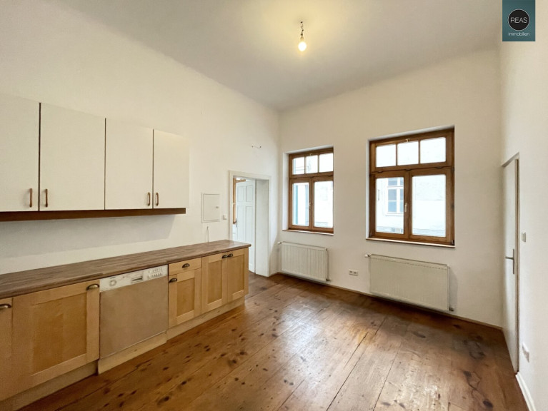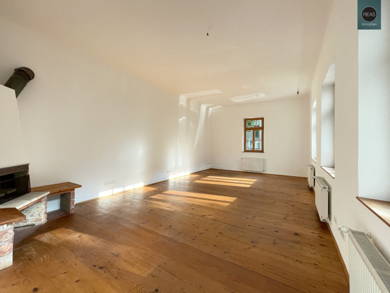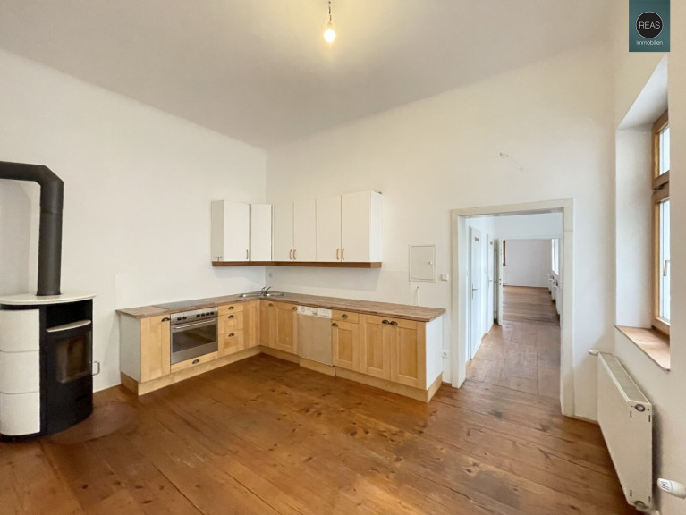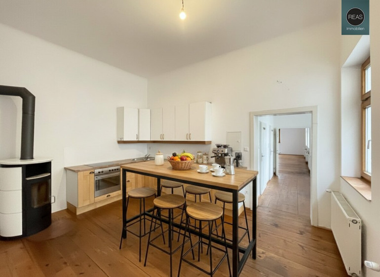 - 1 Zimmer mit Einbauküche, Kaminofen sowie Platz für einen Essbereich