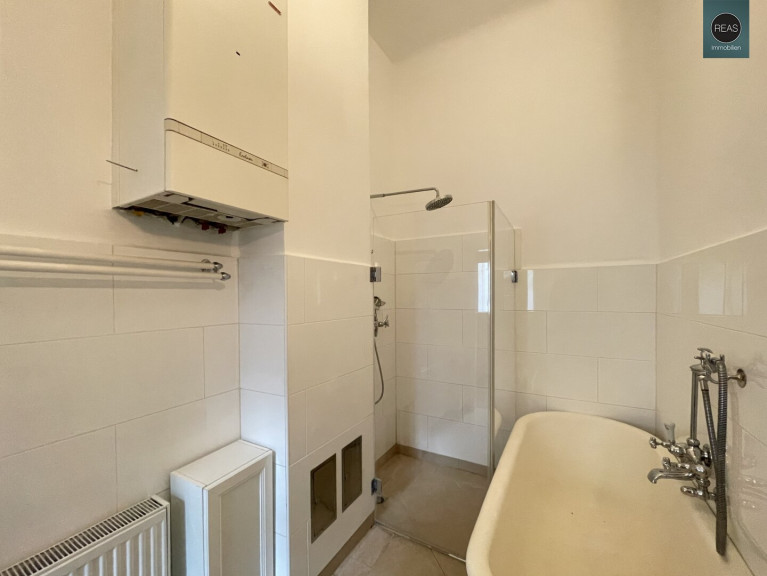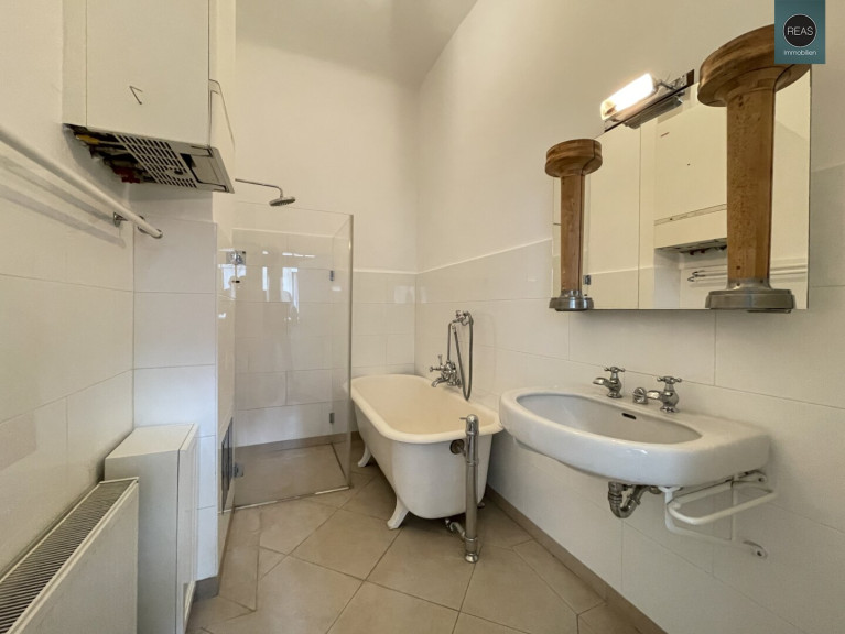 - 1 BAD mit Waschbecken, Badewanne, Dusche mit Glaswand