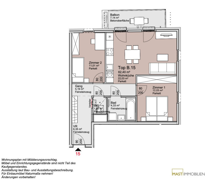 Die Wohnung befindet sich im 2. Liftstock und verfügt über 62,40 m² Wohnfläche + einen 7,14 m² großen Balkon.