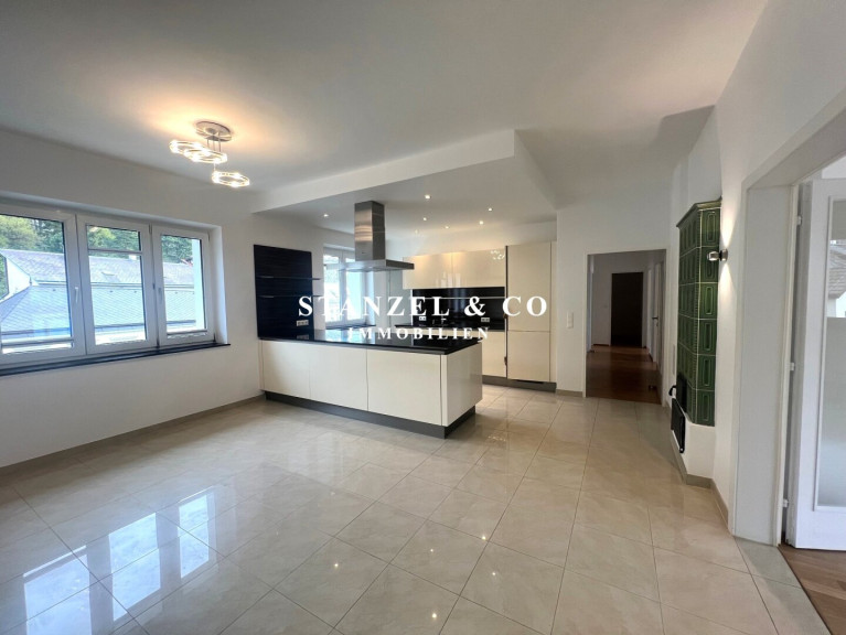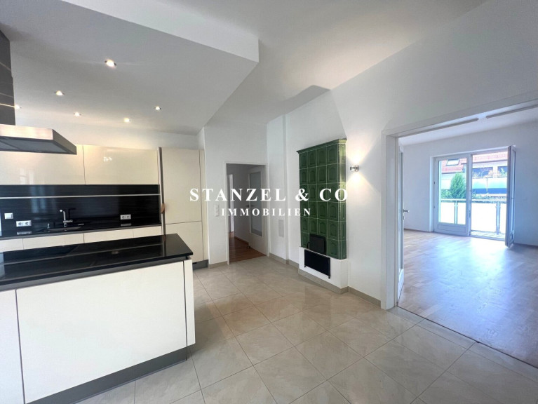Vom Vorzimmer gelangt man in das sonnige 65m² Wohnesszimmer mit moderner offener Küche und schönem Kachelofen der beidseitig sowohl zum Essbereich als auch Wohnbereich ausgerichtet ist. Der Wohn- und der Essbereich sind durch eine schöne Glasflügeltüre verbunden. Anschließend befindet sich die sonnige, gartenseitige 44m² Südwestterrasse. Die Küche ist mit Ceranfeld, Dunstabzug, elektrisches Backrohr, Geschirrspüler, Kühl-Gefrierkombi und einer Speis versehen. Die 3 Schlafzimmer sind zentralbegehbar und hell sowie ruhig. Das Badezimmer ist mit Fenster, Wanne, Glasdusche, Doppelwaschtisch mit Unterschrank & Schrank, Waschmaschinenanschluss, fliesenbündigem Spiegel mit Beleuchtung und elektrischer Entlüftung versehen. Des Weiteren gibt es einen Abstellraum und 2 WCs .