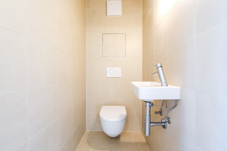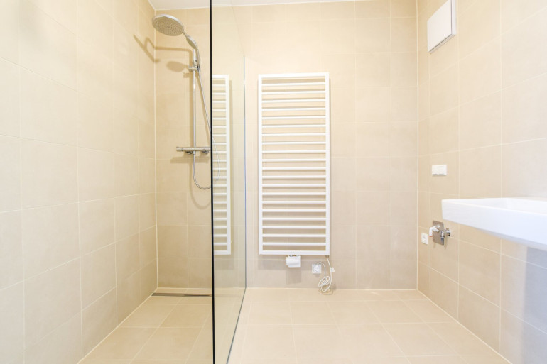 - Bad mit bodenebener Dusche, Waschtisch und Waschmaschinenanschluss