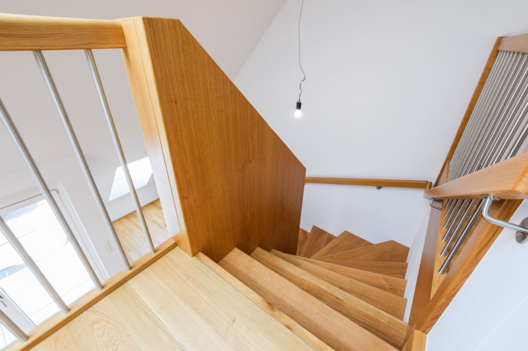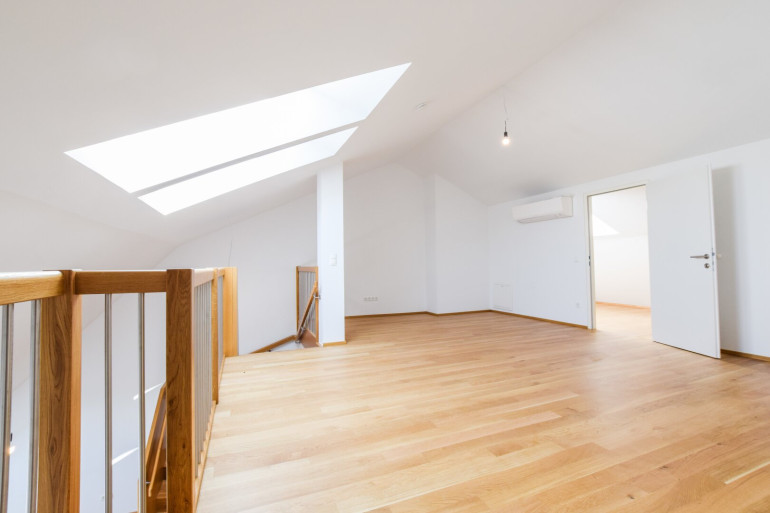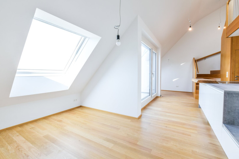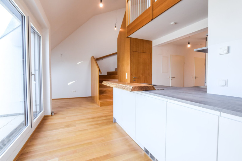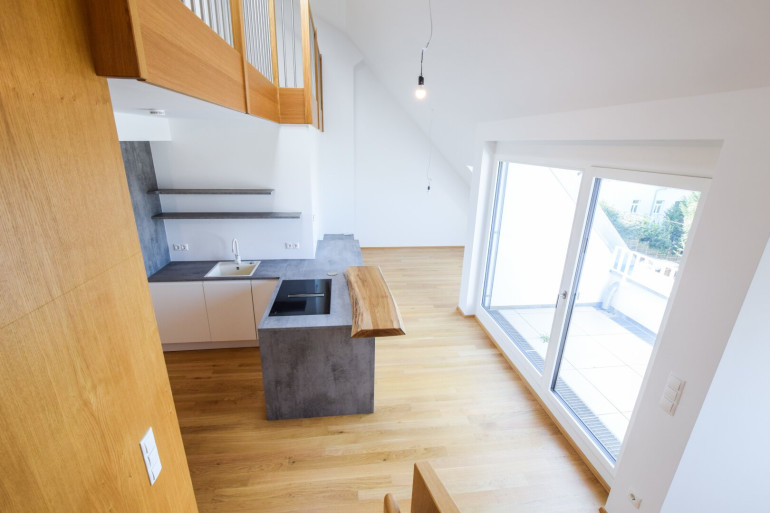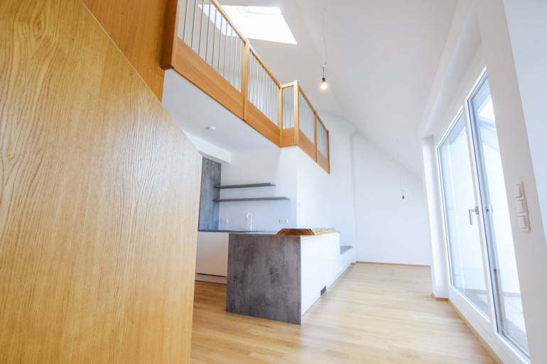 Die teilmöblierte Wohnung weist eine Wohnfläche von ca. 114 m² - aufgeteilt auf 2 Geschoße - sowie zwei Terrassen mit insgesamt ca. 25m² auf. Der Grundriss im 1. Dachgeschoß unterteilt sich in einen Vorraum, ein Badezimmer mit bodenebener Dusche, Waschtisch und Waschmaschinenanschluss, ein separates WC, zwei Schlafzimmer (davon eines mit Zugang zur ost-seitigen Terrasse) sowie eine großzügige Wohnküche mit Zugang zur west-seitigen Terrasse. Die traumhafte Tischlerküche mit hochwertigen Geräten der Marke Miele lädt zum Kochen ein. Insbesondere der Induktionsherd mit in der Kochplatte integriertem Dunstabzug bildet ein Highlight dieser tollen Küche. Der Neupreis der Küche beträgt ca. 24.000€. Auch bietet die Küche ausreichend Stauraum, da die Küchenzeile um die Ecke (Richtung Wohnzimmer) erweitert wurde. Weiteren Stauraum finden Sie im Abstellraum unter der hochwertigen Eichenholz-Treppe, welche von der Wohnküche auf die Galerie im 2. Dachgeschoß führt. Die Galerie bildet ein weiteres Highlight der Wohnung und wird durch großzügige Dachflächenfenster mit Licht durchflutet. Die Galerie führt in einen abgetrennten Dachbodenbereich mit ca. 26 m2, welcher zwar nicht zur Wohnfläche zählt, aber dennoch gleichwertig genutzt werden kann.