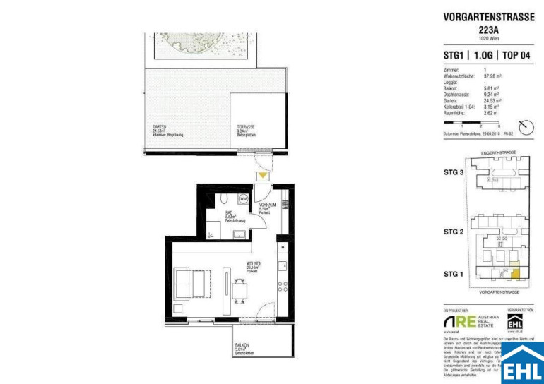 Die Wohnung selbst befindet sich in der 1. Etage und gliedert sich in einen Wohn-Schlafraum mit Einbauküche, ein Badezimmer mit Dusche, Waschmaschinenanschluss und Toilette, sowie einen Vorraum. Das Highlight der Wohnung bilden der Balkon, sowie der Garten mit Terrasse, der der Wohnung zugeordneten ist.